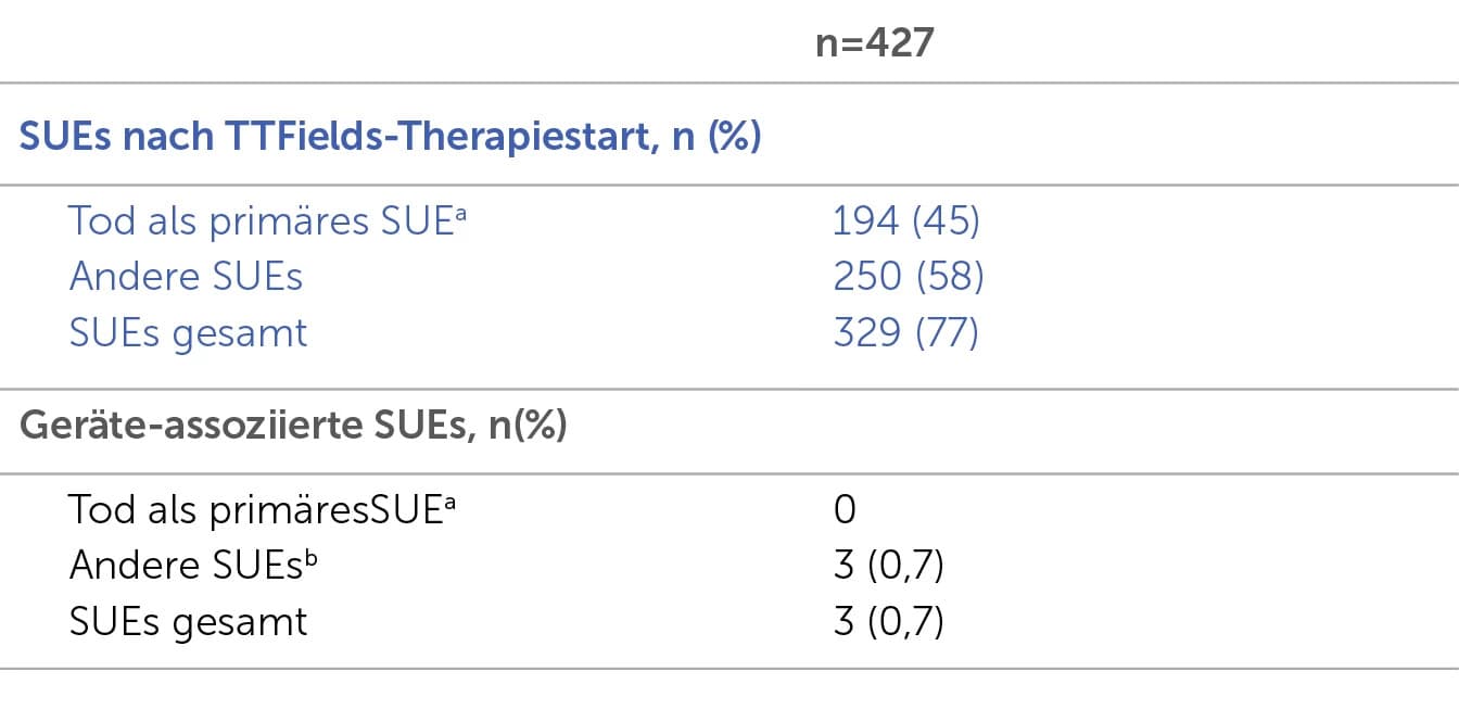 SUE = schwerwiegendes unerwünschtes Ereignis, TTFields = Tumor Treating Fields, KI = Konfidenzinterval.