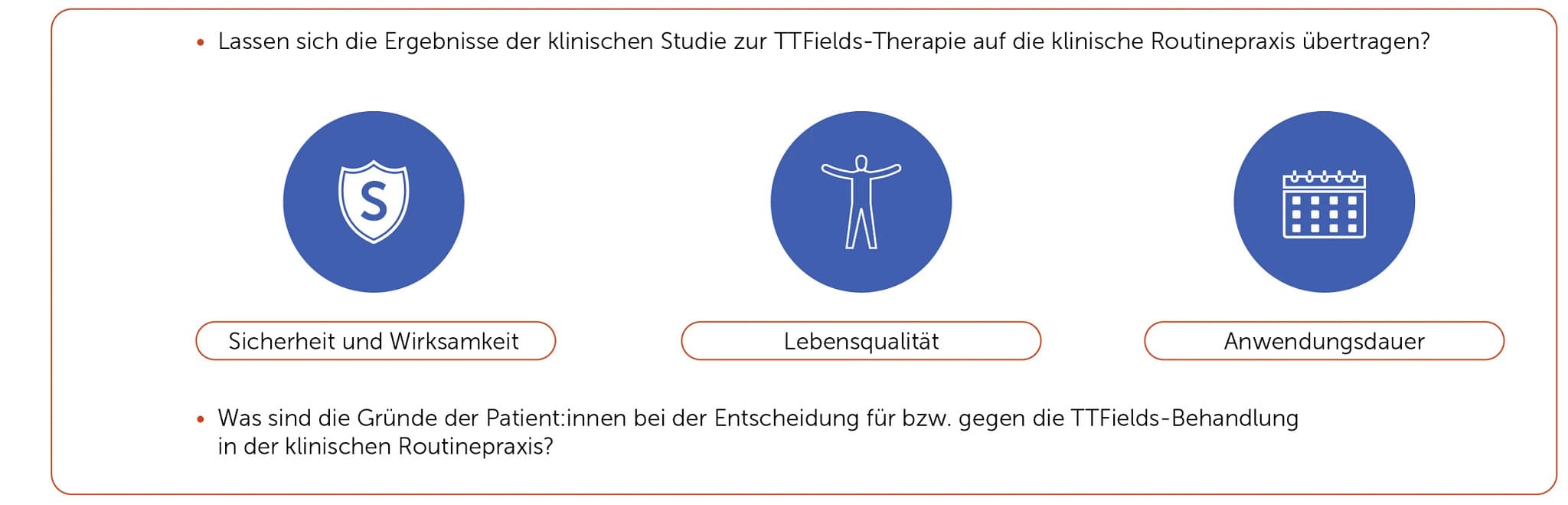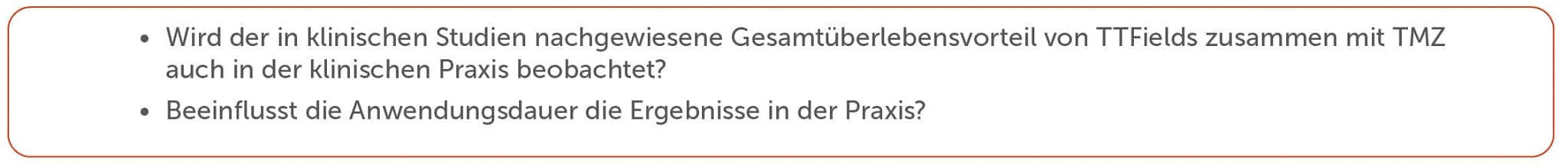 - Multizentrische, prospektive, nicht-interventionelle Studie zum Einsatz von TTFields in der klinischen Routine.