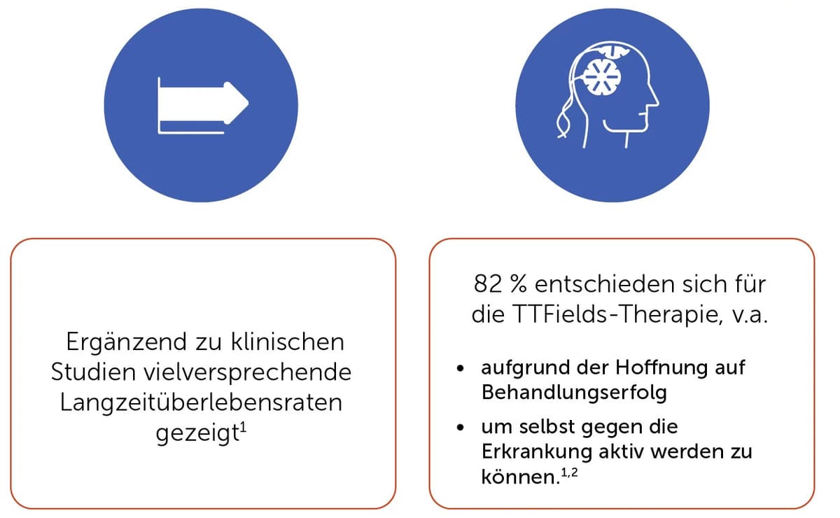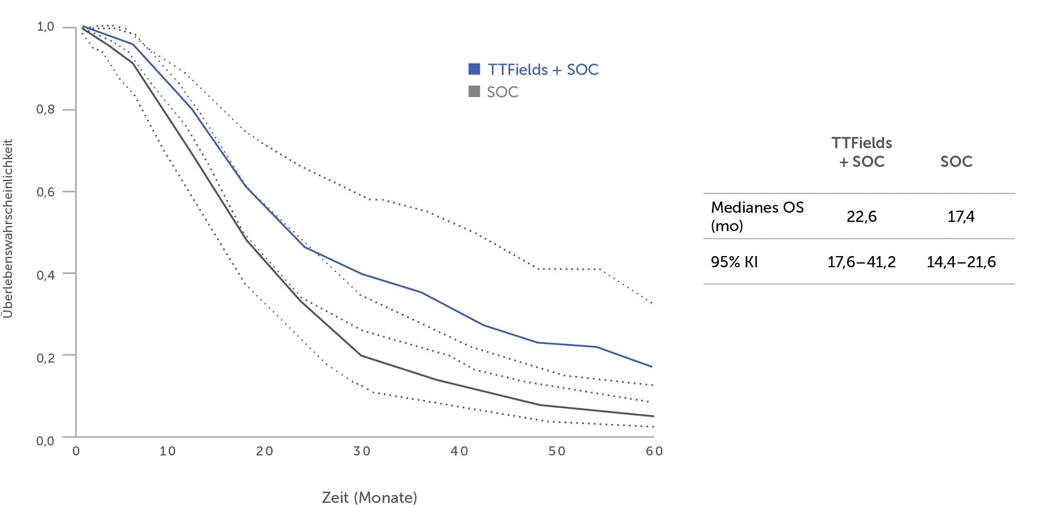 GBM = Glioblastom, KI = Konfidenzintervall, OS = Gesamtüberleben, SOC = Standard Of Care, TTFields = Tumor Treating Fields.