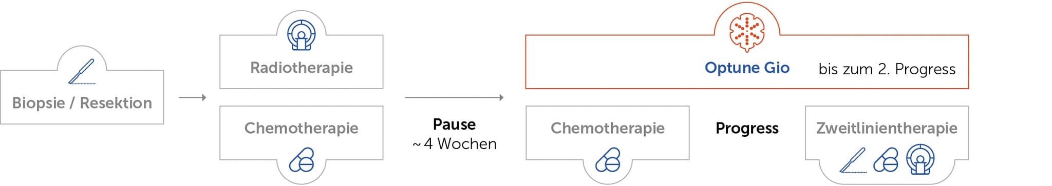 Optune Gio ist tragbar, lokal und nicht-invasiv und wird zur Behandlung des neu diagnostizierten Glioms WHO-Grad 4 eingesetzt. Die Behandlung mit Optune Gio beginnt in der Regel 4 Wochen nach Abschluss der kombinierten Radiochemotherapie zusammen mit der adjuvanten Erhaltungschemotherapie.1,a